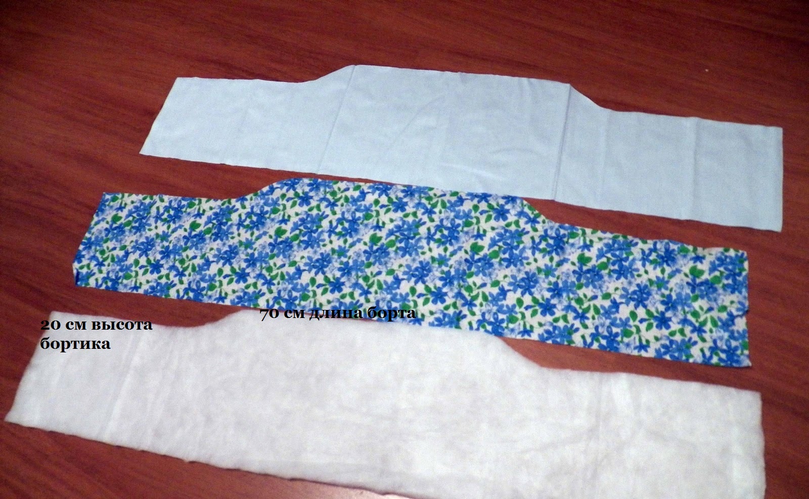 - Измерьте ширину и длину коляски и вырежьте дно люльки на два сантиметра меньше полученных размеров. Выкройте его из ткани для внешней, внутренней обивки и утеплителя.