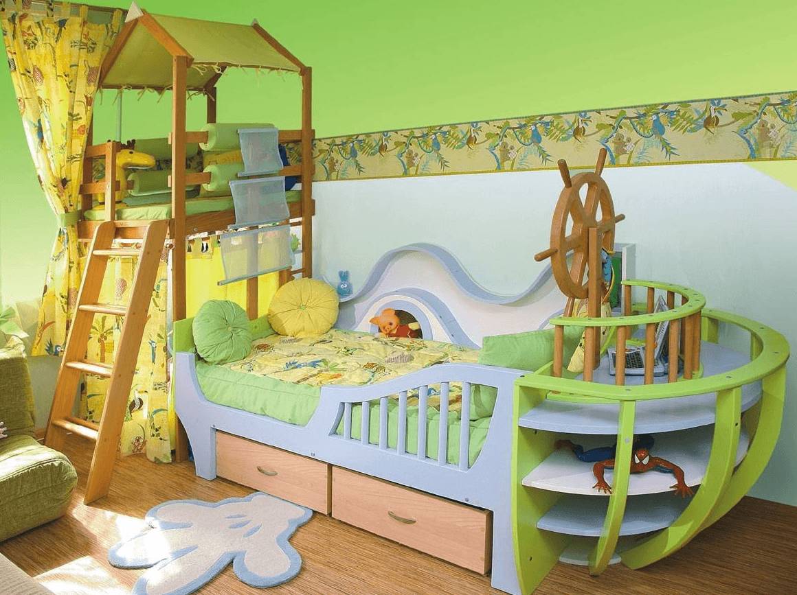 - Интерьер детской комнаты должен быть очень уютным: мягкий коврик, красивые обои с любимыми персонажами. Хорошо, если малыш сам выберет себе кроватку (например, в форме автомобиля или двухэтажного домика). Некоторых малышей пугает пустота под кроватью — туда следует поместить ящики с игрушками.