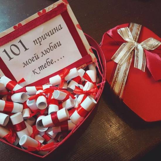 Когда все сто причин готовы, можно заниматься оформлением подарка. Фразы лучше напечатать на цветной бумаге, оформив каждую карточку вензелями. Если в коллекции будут преобладать шуточные признания, к каждому предложению можно добавить эмодзи.